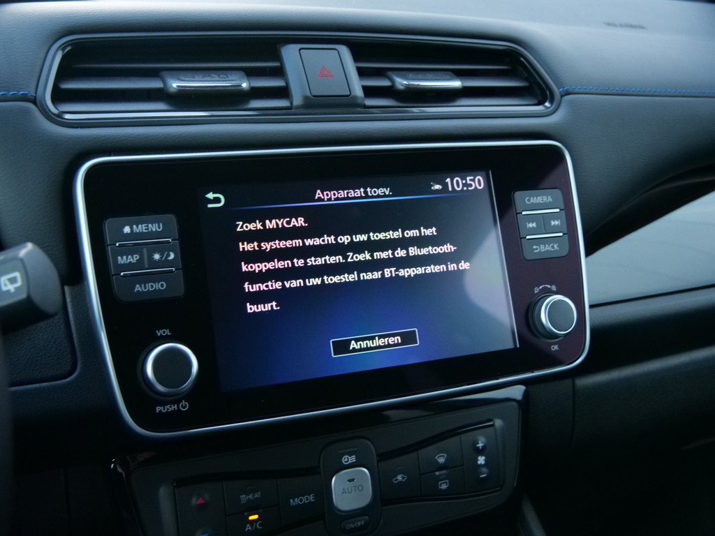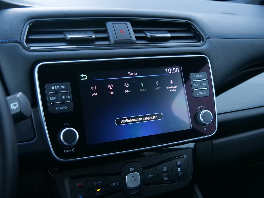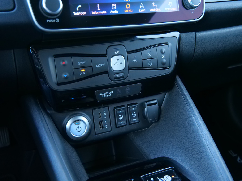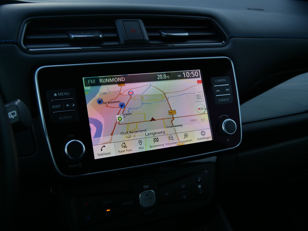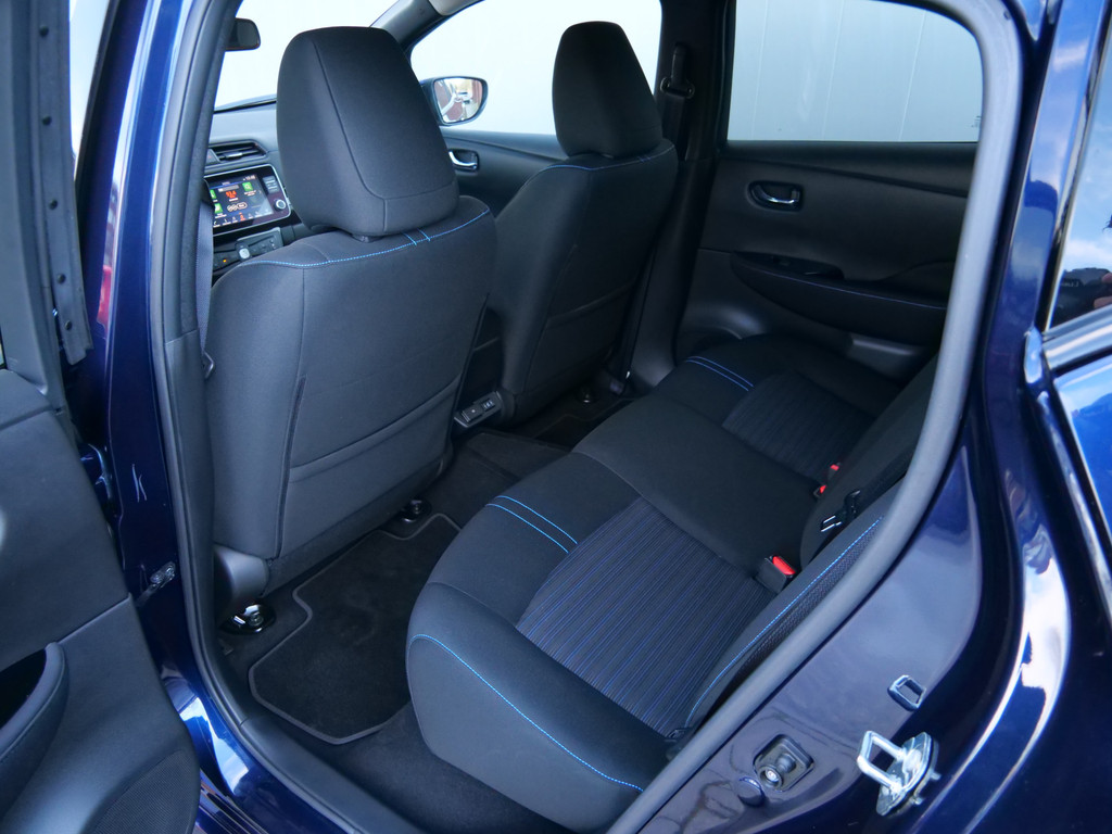Met het digitale dashboard in deze auto kunt u de interface van uw cockpit personaliseren. Of u nu achteruit rijdt, parkeert of een smalle straat inslaat, de 360 graden camera op deze auto, mogelijk gemaakt door vier camera's, biedt een perfect beeld van uw omgeving. Adaptive cruise control is een comfortabele en veilige optie. Het systeem reguleert de snelheid en houdt automatisch afstand tot uw voorligger. Deze Nissan LEAF is 'connected'. Belangrijke functies worden permanent gemeten en zijn uit te lezen via een speciale app, ook op afstand. Altijd een deskundige gids aan boord, dankzij het full map navigatiesysteem. Deze Nissan is voorzien van automatische airconditioning, DAB ontvangst, regensensor, keyless entry, automatisch dimmende binnenspiegel en lederen stuur.