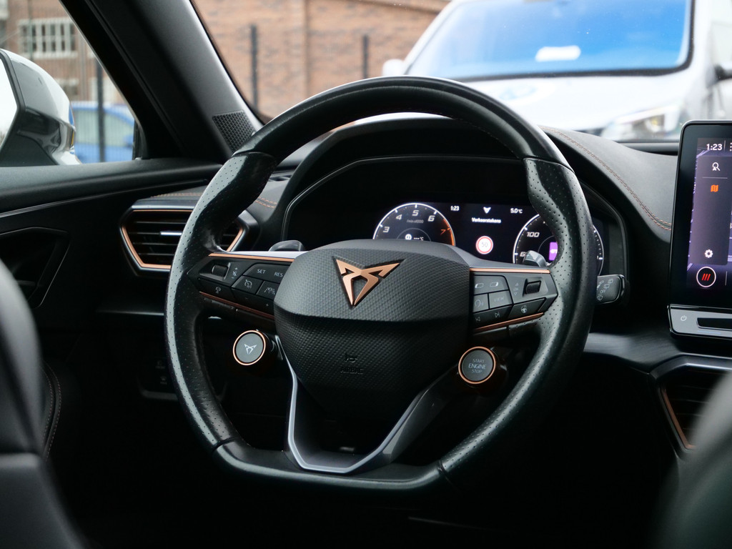Uw nieuwe auto staat klaar voor vertrek. Stap gerust in, deze CUPRA Formentor heeft 67798 kilometer gelopen en is van het bouwjaar 2021. Trap het gaspedaal in en voel de geweldige acceleratie van deze auto. Voorin is het 's winters genieten met de verwarmbare voorstoelen voor zowel bestuurder als bijrijder. De sportstoelen geven het interieur een super strakke look. Van binnen lijkt het allemaal uitermate ruim dankzij de vrije inval van daglicht via het elektrisch bediende glazen panoramadak. Een praktische extra is de elektrisch bedienbare achterklep die opent en sluit met een druk op de knop. Bij de rijke uitrusting horen ook 19 inch lichtmetalen velgen, LED koplampen, halflederen bekleding, adaptief dempingsysteem, donker getint glas achter en in delen neerklapbare achterbank.