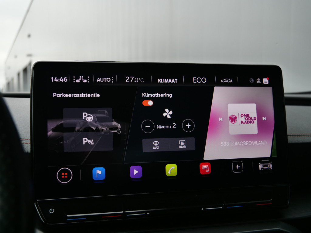 Zoals u mag verwachten van deze CUPRA Formentor is hij uitgerust met een reeks aan actieve veiligheidssystemen. Tijdens de rit hebt u altijd een bijrijder, want de verkeersbord-detectie leest de borden langs de weg en projecteert ze voor u op het instrumentarium. Het Lane-keeping systeem doet precies wat nodig is: waarschuwen en corrigeren bij onbedoelde overschrijding van de rijstrooklijnen. Onbedoeld bumperkleven is er niet bij, dankzij de forward collision warning. Die waarschuwt direct als een botsrisico met uw voorligger dreigt. Ook helpen het hill hold functie, vermoeidheidsherkenning, autonoom remsysteem en bandenspanningcontrolesysteem, uw rit tot een veilige rit te maken.