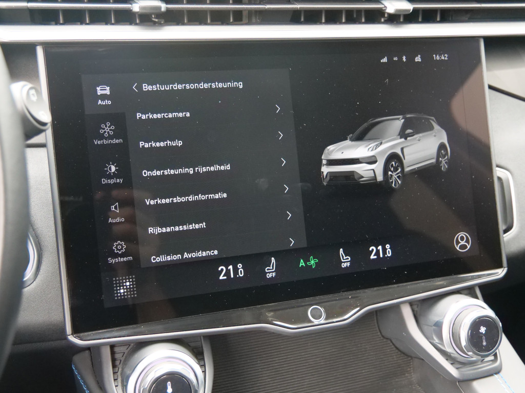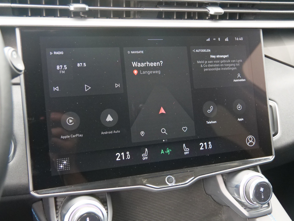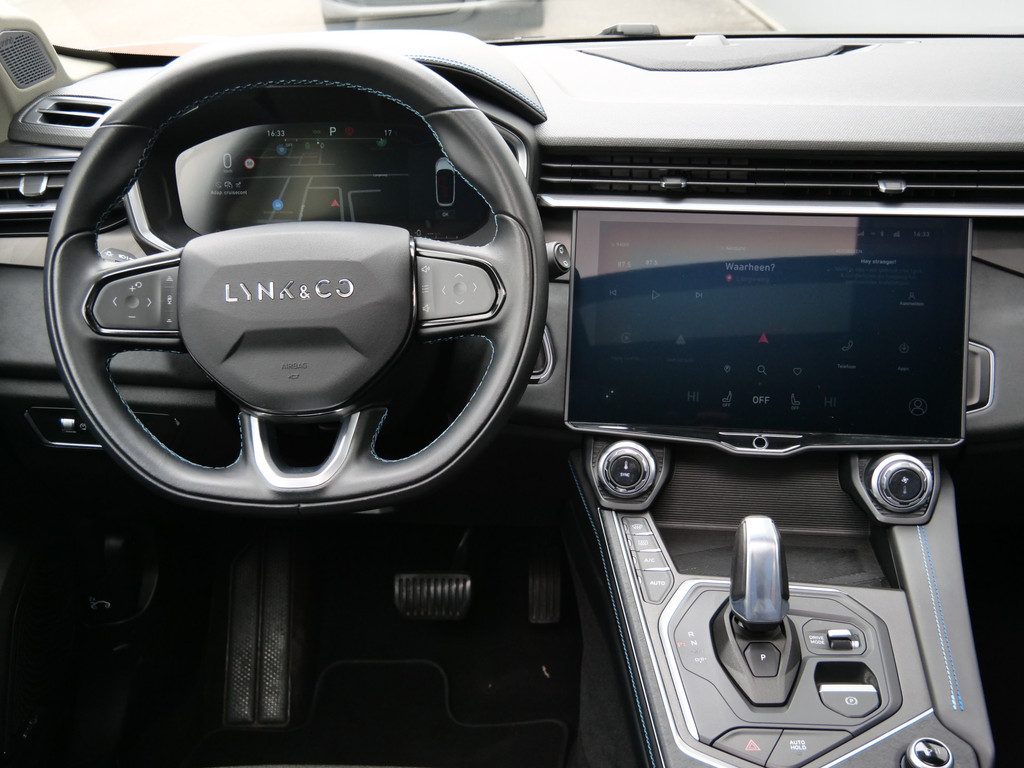 Als bestuurder van deze Lynk & Co bent u nooit alleen. U wordt onderweg bijgestaan door technologische hulpmiddelen die samen met u de weg in de gaten houden. Als het nodig is, grijpen ze zelfs in, door te remmen of bij te sturen. Onderweg fungeert de verkeersbord-detectie als het ware als uw bijrijder en attendeert u op de verkeersborden langs de weg. Het Lane-keeping systeem registreert permanent of u binnen de lijnen van de rijstrook blijft; dwaalt u onbedoeld af, dan waarschuwt het systeem en corrigeert de koers. Het risico van een kop-staartbotsing wordt aanzienlijk verminderd door de forward collision warning. In deze Lynk & Co vinden we verder een dodehoekdetectie, hill hold functie, brake assist en vermoeidheidsherkenning.