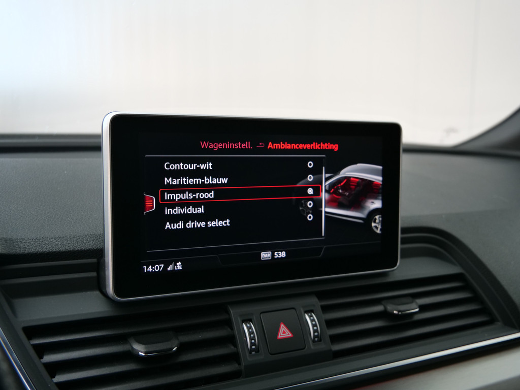 U merkt het aan de look and feel van deze auto: dit is kwaliteit. De Audi Q5 is ontworpen volgens de Duitse opvattingen van kwaliteit en degelijkheid, maar biedt tegelijk een hoge mate van comfort en uitstekende rijkwaliteiten. Een beetje meer aandacht en een stoere uitstraling? Daar zorgt de S-Line styling voor. Een viercilinder benzinemotor en een automatische transmissie zorgen voor de uitstekende prestaties van deze auto. Op zelfs de koudste ochtend biedt de stoelverwarming een heerlijk welkom. De elektrische achterklep opent met een druk op de knop, zodat u gemakkelijk toegang heeft tot de bagageruimte. In deze auto profiteert u onder andere ook van: 20 inch lichtmetalen velgen, LED koplampen, sportonderstel, adaptief dempingsysteem, warmtewerend glas en in delen neerklapbare achterbank.