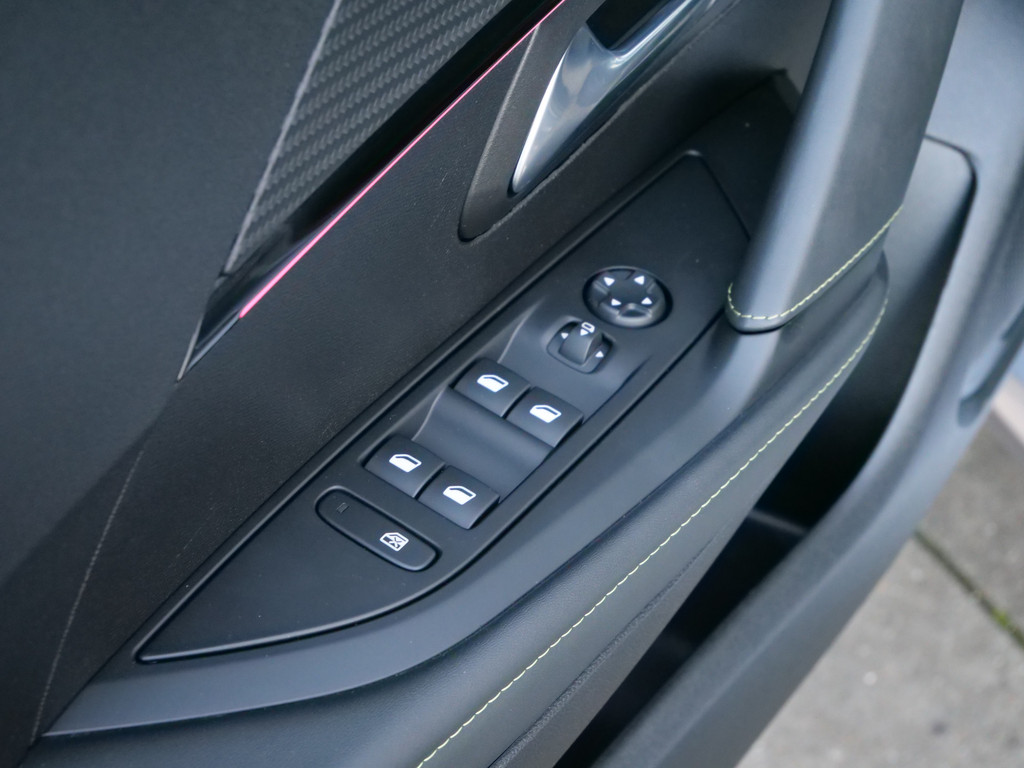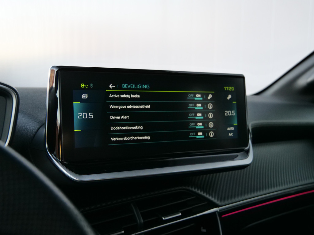 De Peugeot e-208 is ook voorzien van ADAS. Deze Advanced Driver Assistence Systems fungeren als extra ogen en oren: ze houden voor u de weg in de gaten en grijpen in wanneer dat nodig is. Een belangrijke bijdrage aan de veiligheid onderweg levert de verkeersbord-detectie. Indien u onbedoeld de rijstrook lijkt te verlaten, reageert het Lane-keeping systeem meteen en corrigeert. Elke auto heeft een of meer blinde vlekken. De actieve dodehoekdetectie waarschuwt als er gevaar voor een aanrijding bestaat. Verder is deze auto uitgerust met forward collision warning system, vermoeidheidsherkenning, autonoom remsysteem en bandenspanningcontrolesysteem.