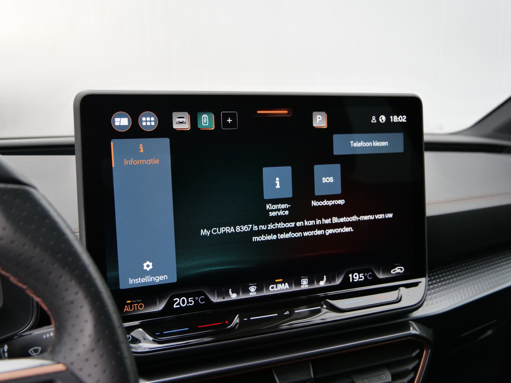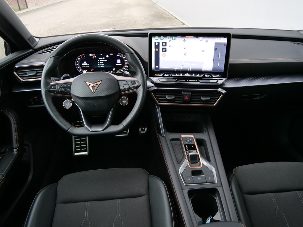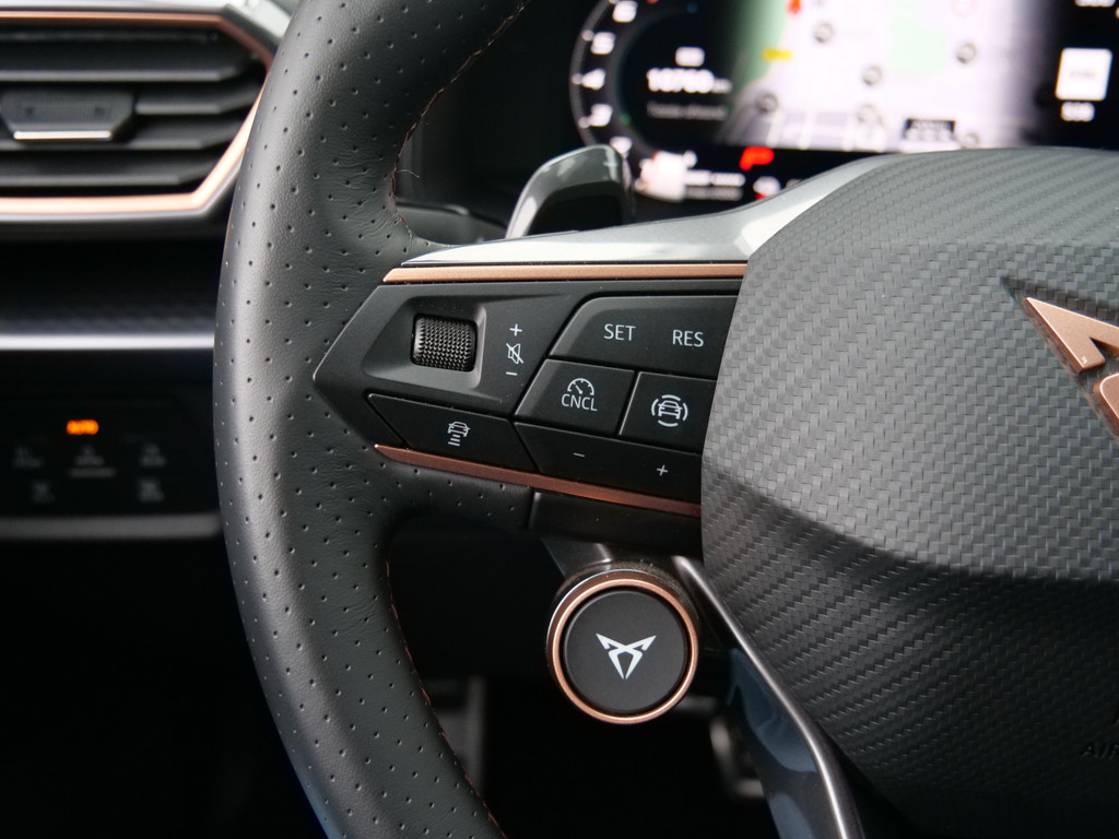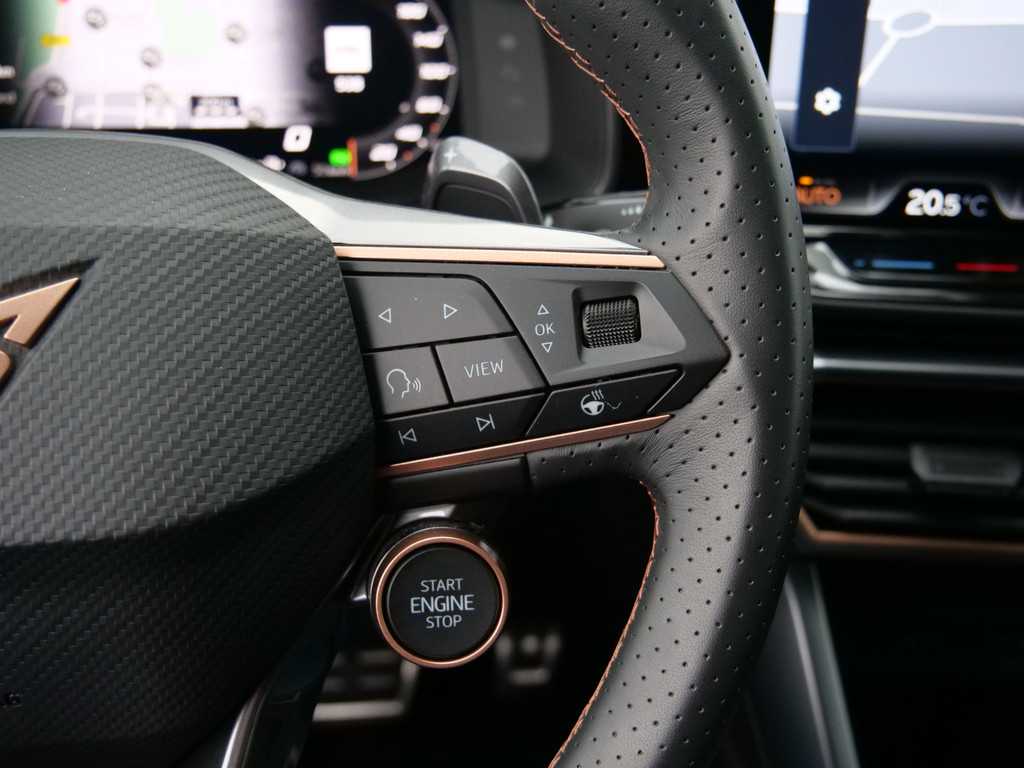 Alle functies voor een veilige en zuinige rit worden overzichtelijk weergegeven op het digitale dashboard. Ook achter de auto geen verrassingen bij het inparkeren. Daarvoor zorgt de achteruitrijcamera. Adaptive cruise control houdt de ingestelde snelheid vast en houdt afstand tot het voertuig voor u. In deze auto kunt u de belangrijkste functies bedienen met uw stem. U weet altijd hoe de auto eraan toe is dankzij Connected Services. Ook handig voor de garage en de wegenwacht. Even de app uitlezen en klaar! Deze CUPRA is voorzien van full map navigatiesysteem, electronic climate control, schakelpaddles aan het stuur, draadloos opladen, DAB ontvangst en regensensor.