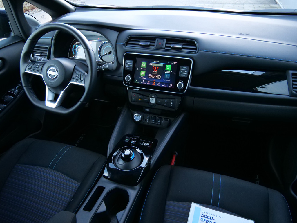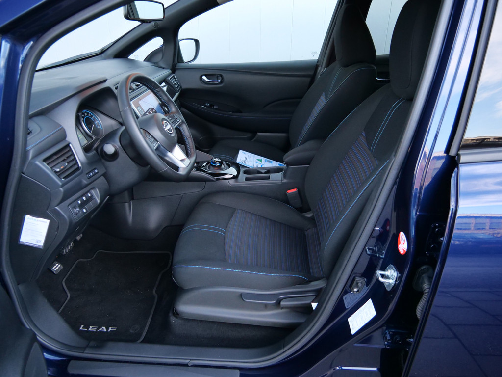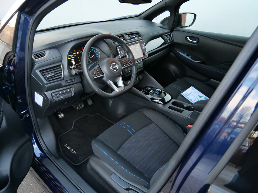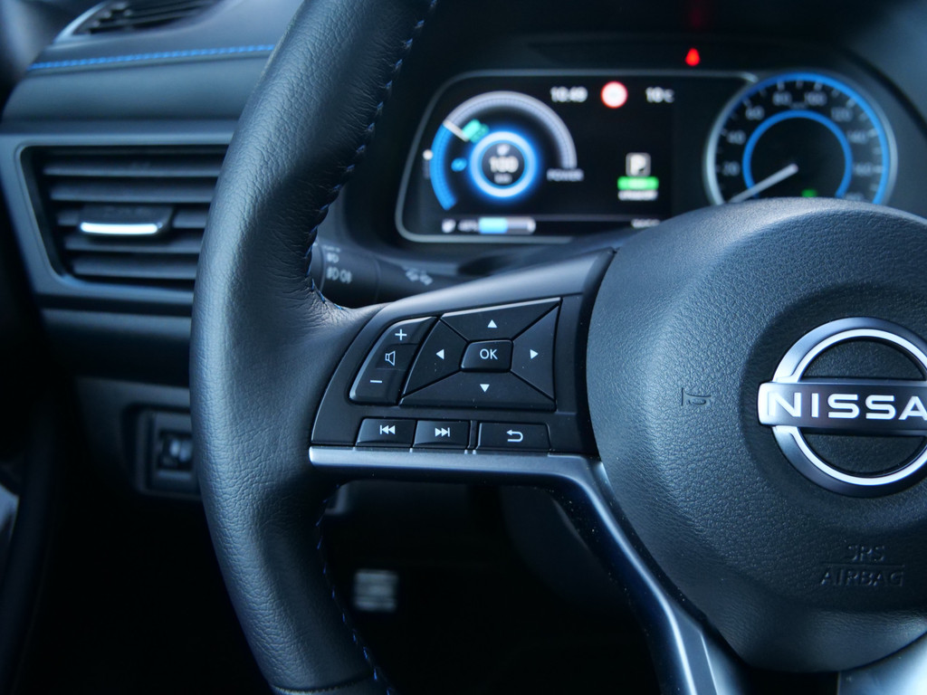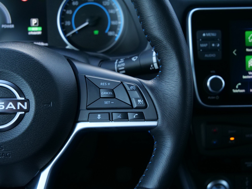 Met het digitale dashboard in deze auto kunt u de interface van uw cockpit personaliseren. Of u nu achteruit rijdt, parkeert of een smalle straat inslaat, de 360 graden camera op deze auto, mogelijk gemaakt door vier camera's, biedt een perfect beeld van uw omgeving. Adaptive cruise control is een comfortabele en veilige optie. Het systeem reguleert de snelheid en houdt automatisch afstand tot uw voorligger. Deze Nissan LEAF is 'connected'. Belangrijke functies worden permanent gemeten en zijn uit te lezen via een speciale app, ook op afstand. Altijd een deskundige gids aan boord, dankzij het full map navigatiesysteem. Deze Nissan is voorzien van automatische airconditioning, DAB ontvangst, regensensor, keyless entry, automatisch dimmende binnenspiegel en lederen stuur.