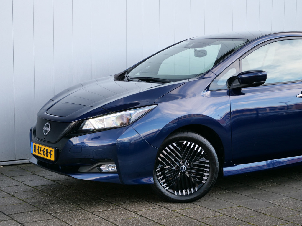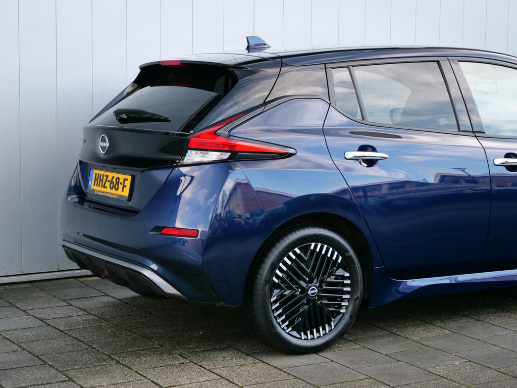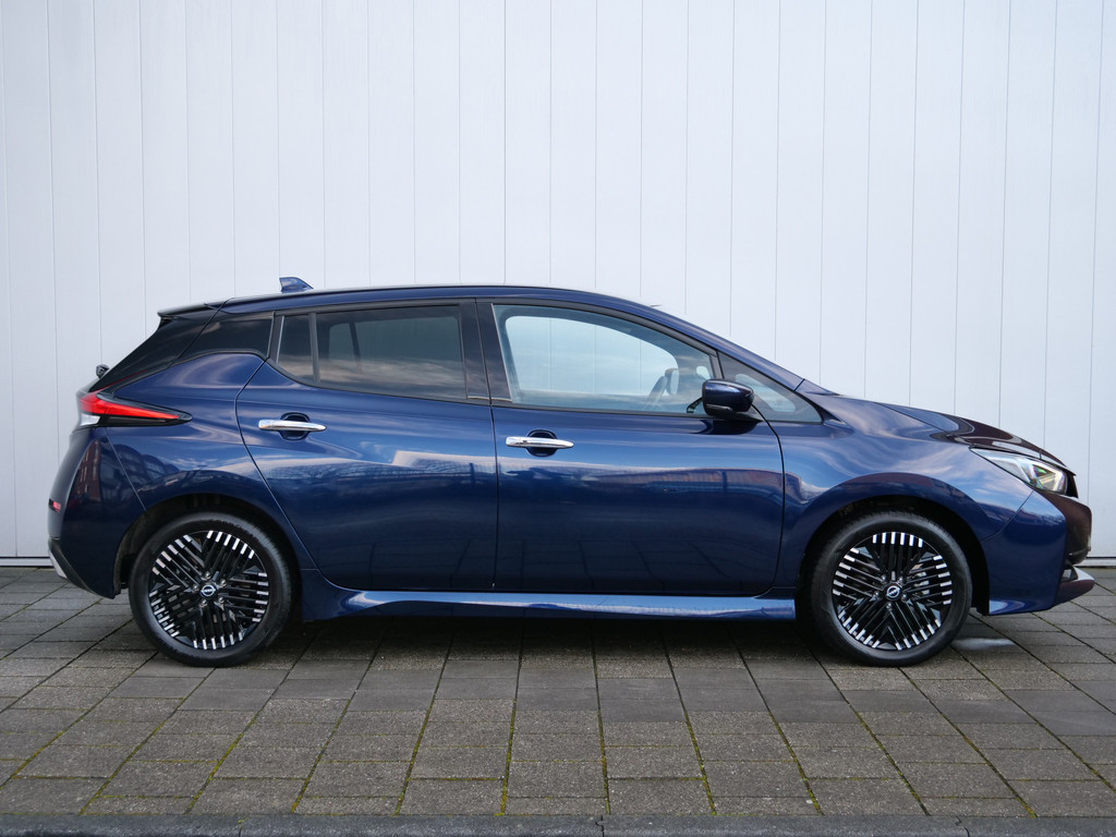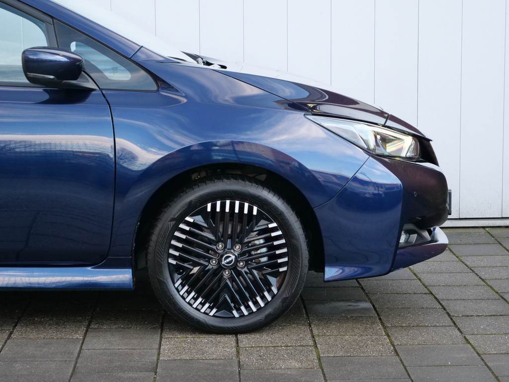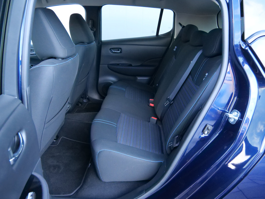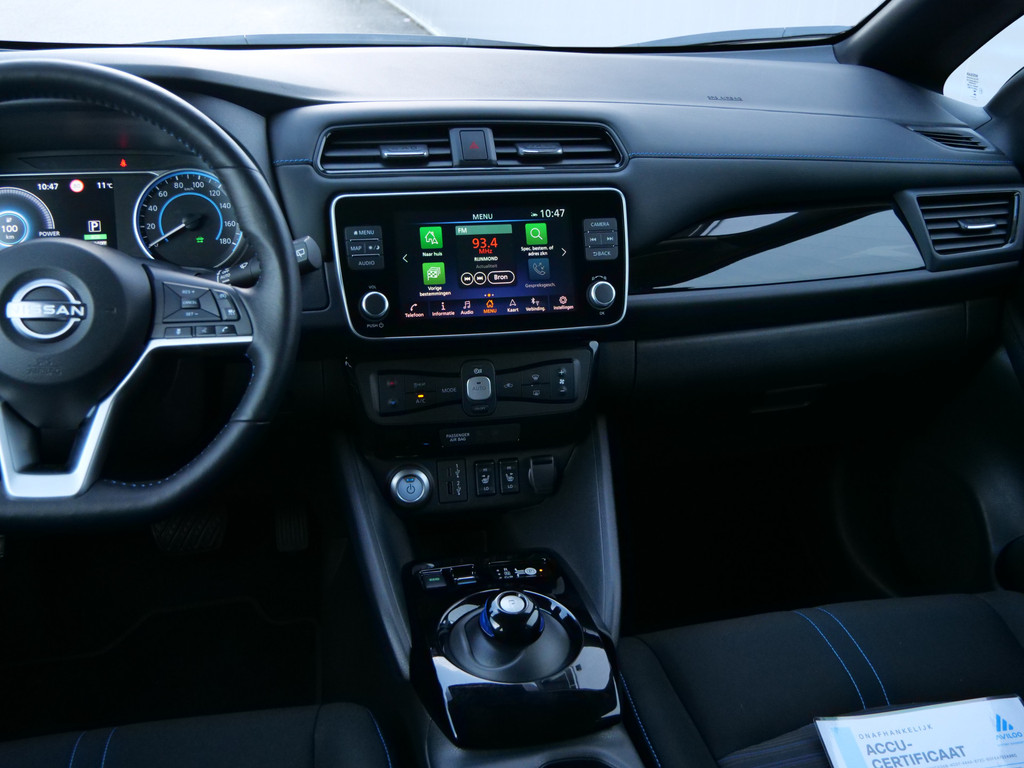 Met het digitale dashboard in deze auto kunt u de interface van uw cockpit personaliseren. Of u nu achteruit rijdt, parkeert of een smalle straat inslaat, de 360 graden camera op deze auto, mogelijk gemaakt door vier camera's, biedt een perfect beeld van uw omgeving. Adaptive cruise control is een comfortabele en veilige optie. Het systeem reguleert de snelheid en houdt automatisch afstand tot uw voorligger. Deze Nissan LEAF is 'connected'. Belangrijke functies worden permanent gemeten en zijn uit te lezen via een speciale app, ook op afstand. Altijd een deskundige gids aan boord, dankzij het full map navigatiesysteem. Deze Nissan is voorzien van automatische airconditioning, DAB ontvangst, regensensor, keyless entry, automatisch dimmende binnenspiegel en lederen stuur.