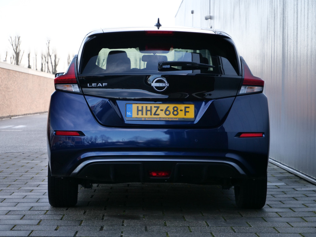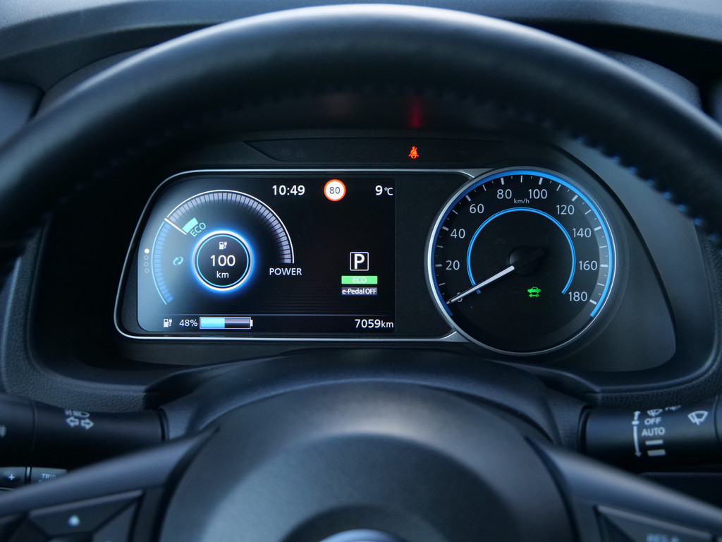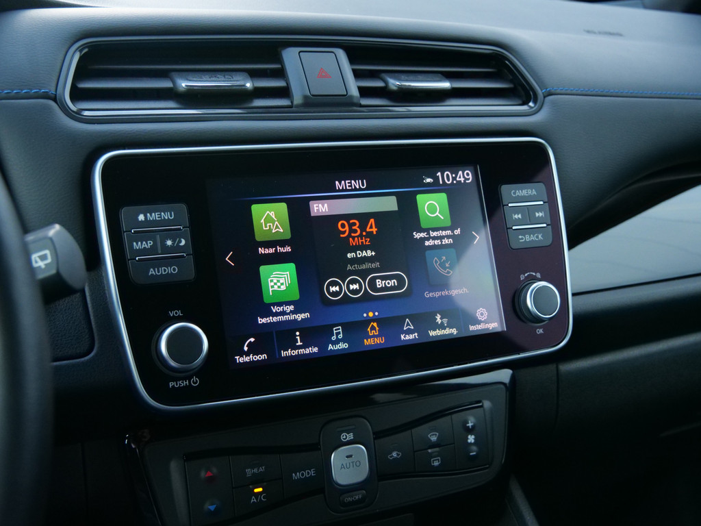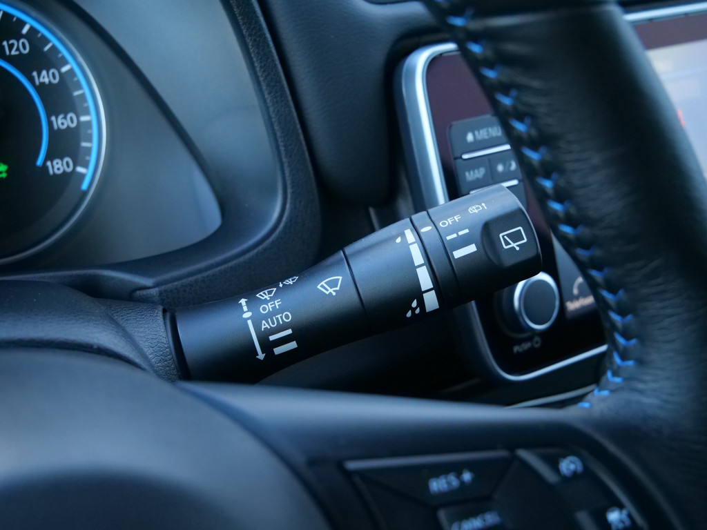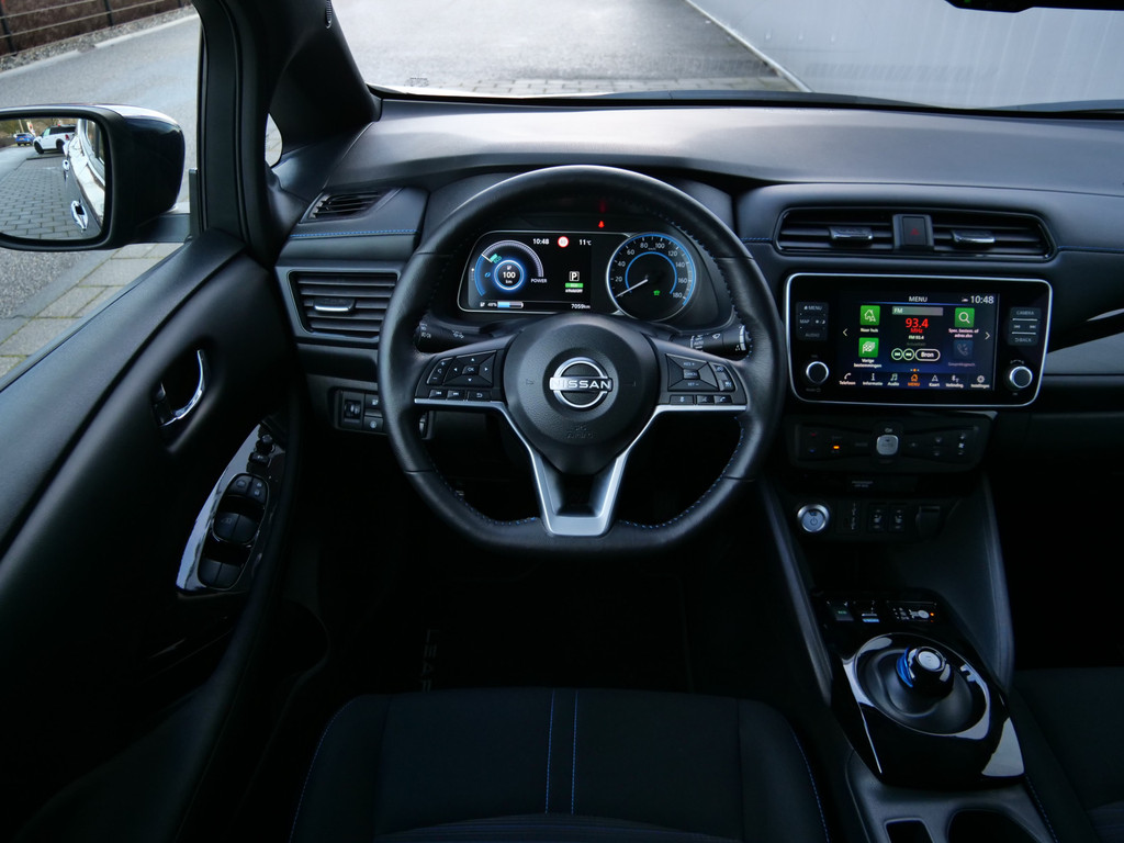 Met het digitale dashboard in deze auto kunt u de interface van uw cockpit personaliseren. Of u nu achteruit rijdt, parkeert of een smalle straat inslaat, de 360 graden camera op deze auto, mogelijk gemaakt door vier camera's, biedt een perfect beeld van uw omgeving. Adaptive cruise control is een comfortabele en veilige optie. Het systeem reguleert de snelheid en houdt automatisch afstand tot uw voorligger. Deze Nissan LEAF is 'connected'. Belangrijke functies worden permanent gemeten en zijn uit te lezen via een speciale app, ook op afstand. Altijd een deskundige gids aan boord, dankzij het full map navigatiesysteem. Deze Nissan is voorzien van automatische airconditioning, DAB ontvangst, regensensor, keyless entry, automatisch dimmende binnenspiegel en lederen stuur.