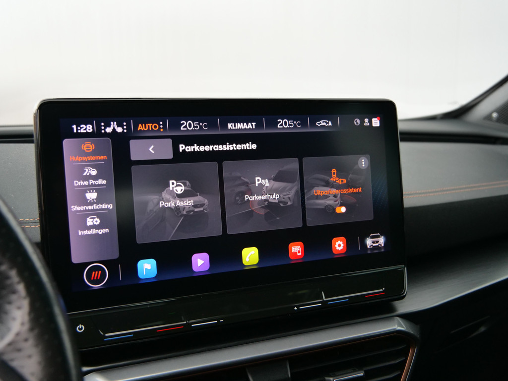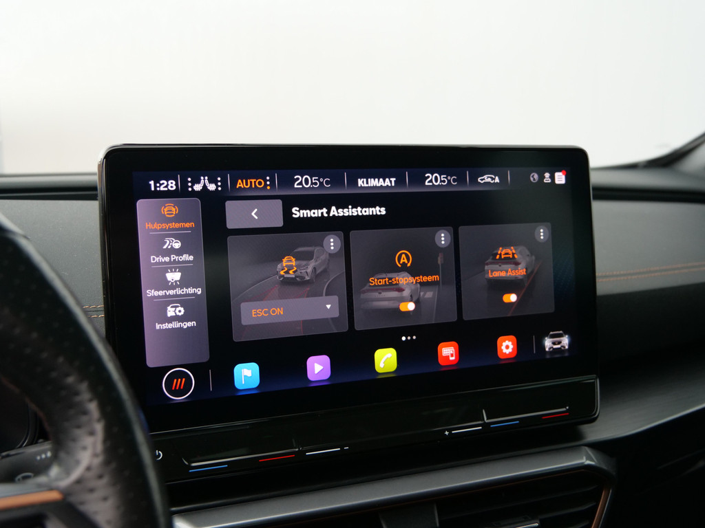 Zoals u mag verwachten van deze CUPRA Formentor is hij uitgerust met een reeks aan actieve veiligheidssystemen. Dat de auto steeds meer taken van de bestuurder overneemt, merkt u bijvoorbeeld aan het systeem voor verkeersbord-detectie in deze auto. Indien u onbedoeld de rijstrook lijkt te verlaten, reageert het Lane-keeping systeem meteen en corrigeert. Veel aanrijdingen bestaan uit kop-staartbotsingen. De forward collision warning reduceert dat risico aanzienlijk. Bovenop deze veiligheidsfeatures heeft deze CUPRA bovendien dodehoekdetectie, hill hold functie, vermoeidheidsherkenning, autonoom remsysteem en bandenspanningcontrolesysteem.