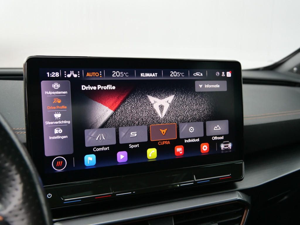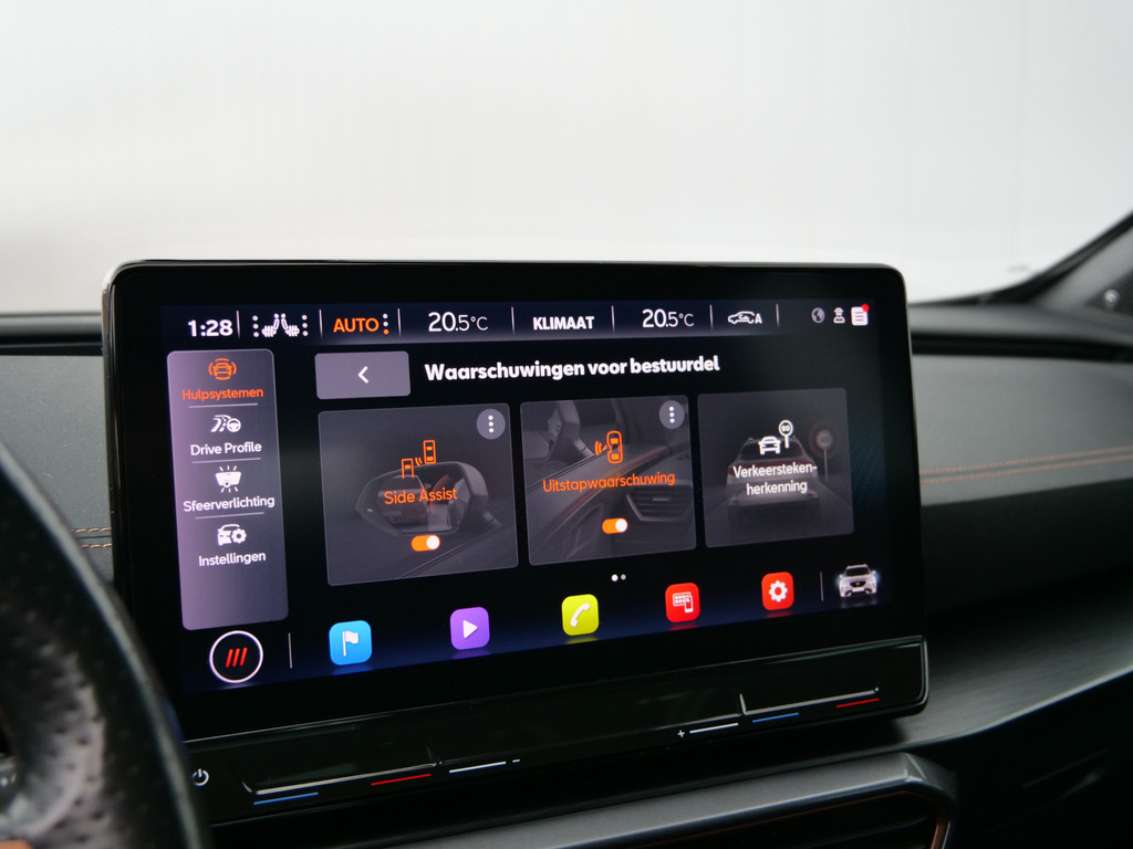 Zoals u mag verwachten van deze CUPRA Formentor is hij uitgerust met een reeks aan actieve veiligheidssystemen. Dat de auto steeds meer taken van de bestuurder overneemt, merkt u bijvoorbeeld aan het systeem voor verkeersbord-detectie in deze auto. Indien u onbedoeld de rijstrook lijkt te verlaten, reageert het Lane-keeping systeem meteen en corrigeert. Veel aanrijdingen bestaan uit kop-staartbotsingen. De forward collision warning reduceert dat risico aanzienlijk. Bovenop deze veiligheidsfeatures heeft deze CUPRA bovendien dodehoekdetectie, hill hold functie, vermoeidheidsherkenning, autonoom remsysteem en bandenspanningcontrolesysteem.