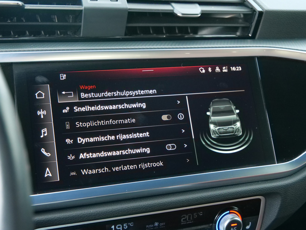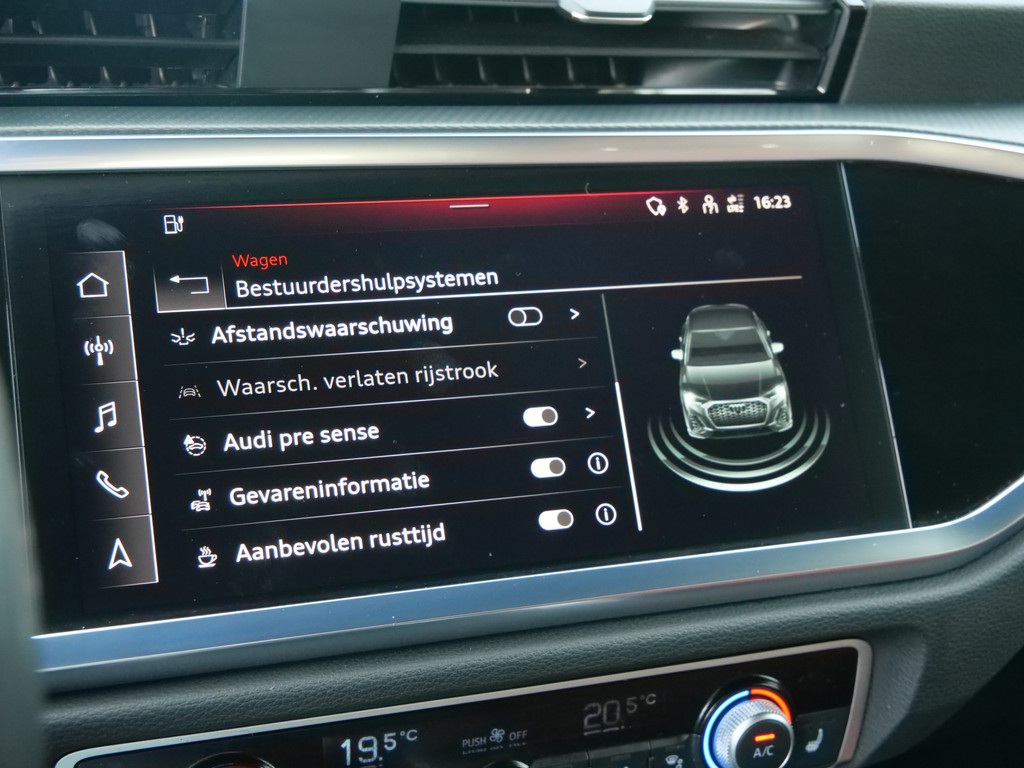 Zoals u mag verwachten van deze Audi Q3 Sportback is hij uitgerust met een reeks aan actieve veiligheidssystemen. Met het Lane-keeping systeem komt u nooit per ongeluk buiten de rijstrook. Forward collision warning is een automatisch waarschuwingssysteem dat direct in werking treedt bij gevaar voor een kop-staartbotsing. Met voorzieningen als hill hold functie, autonoom remsysteem en bandenspanningcontrolesysteem, bent u altijd veilig onderweg.